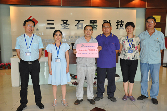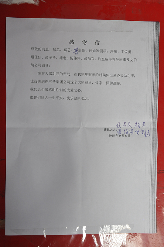 四、 董事長(cháng)親自捐贈善款救助聽(tīng)到侯孝友的實(shí)際困難匯報后,董事長(cháng)非常關(guān)心,立即拿出私人款2000元現金資助,幫助侯孝友度過(guò)暫時(shí)的難關(guān)。鄭董還親自接待了侯孝友,詳細了解了他家庭目前的狀況,鼓勵他樹(shù)立信心,克服暫時(shí)困難,及時(shí)幫助妻子治療,引導兒女安心學(xué)習,同時(shí),希望他在公司本職工作中繼續發(fā)揚不拍苦、腳踏實(shí)地的精神,積極專(zhuān)研技能,不要辜負三圣愛(ài)心傳遞的希望。
