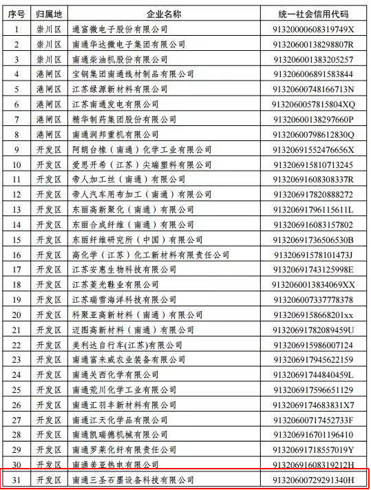 6月2日上午,南通市環(huán)保局公布了關(guān)于2016年度南通市區非國控企業(yè)環(huán)境信用等級評定結果的通知,經(jīng)對南通市區406 家非國控企業(yè)2016 年度環(huán)境信用進(jìn)行評審,確定南通三圣石墨設備科技股份有限公司等50家單位為綠色企業(yè)。