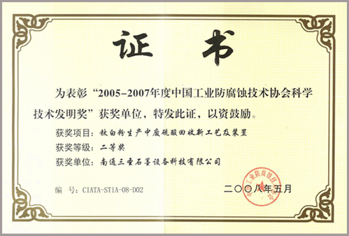 該技術(shù)通過(guò)了江蘇省科技廳科技成果鑒定,先后獲得:南通市人民政府科學(xué)技術(shù)進(jìn)步二等獎、武漢市人民政府科學(xué)技術(shù)進(jìn)步二等獎、中國工業(yè)防腐蝕技術(shù)協(xié)會(huì )科學(xué)技術(shù)發(fā)明二等獎并在多家鈦白企業(yè)中得到了應用。
