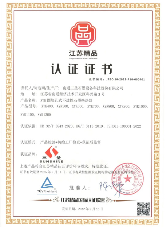 經(jīng)“江蘇精品”國際認證聯(lián)盟認證,南通三圣石墨設備科技股份有限公司榮膺“ 江蘇精品 ”認證 ,成功躋身“江蘇精品”優(yōu)質(zhì)制造業(yè)品牌。