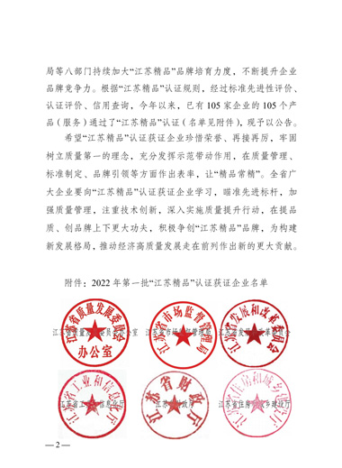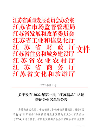 “江蘇精品”是江蘇省為推動(dòng)形成一批自主創(chuàng )新、品質(zhì)高端、服務(wù)優(yōu)質(zhì)、信譽(yù)過(guò)硬、市場(chǎng)公認的“江蘇精品”品牌群體,以行業(yè)龍頭骨干、“專(zhuān)精特新”和“單項冠軍”等企業(yè)為主體認證對象,參照國際慣例、運用市場(chǎng)機制,由江蘇省市場(chǎng)監管局會(huì )同省發(fā)改委等七部門(mén)開(kāi)展的重點(diǎn)認證工作。